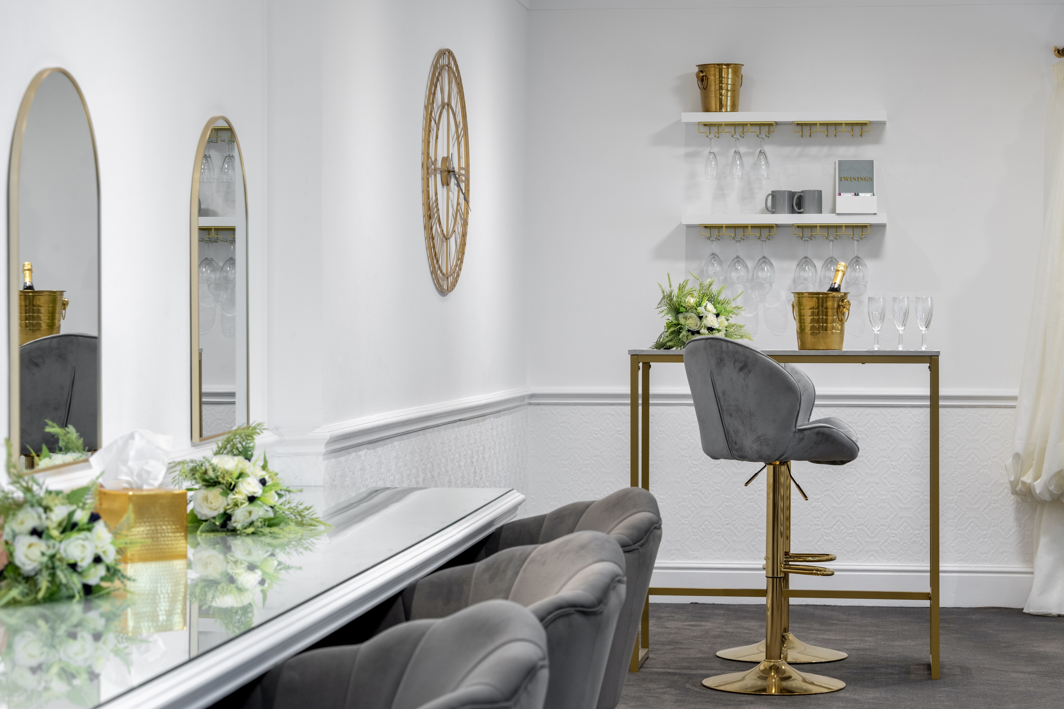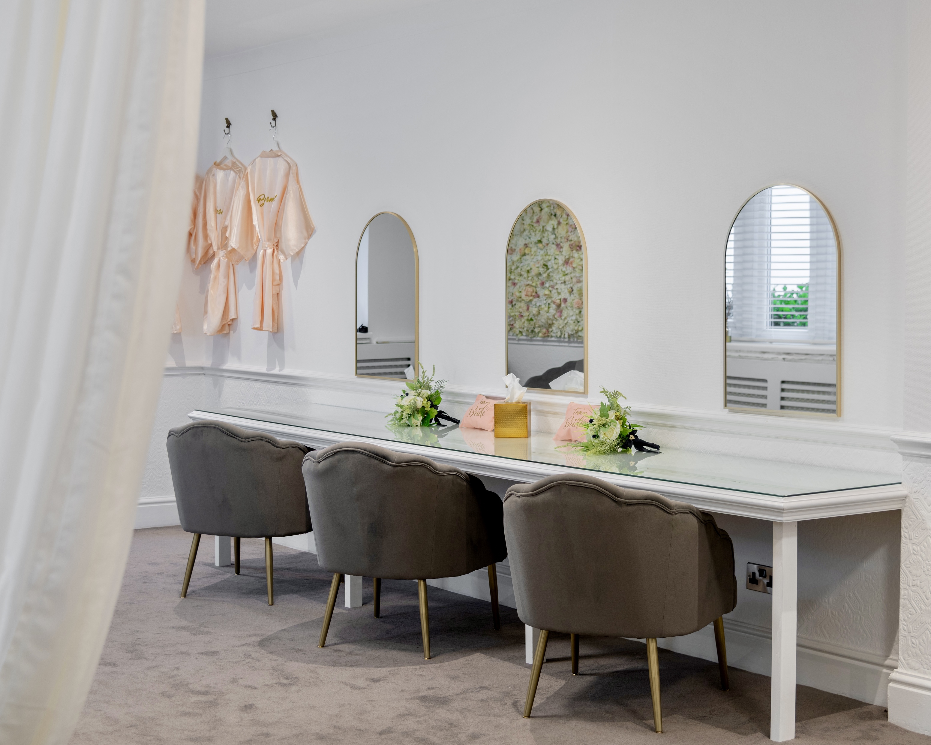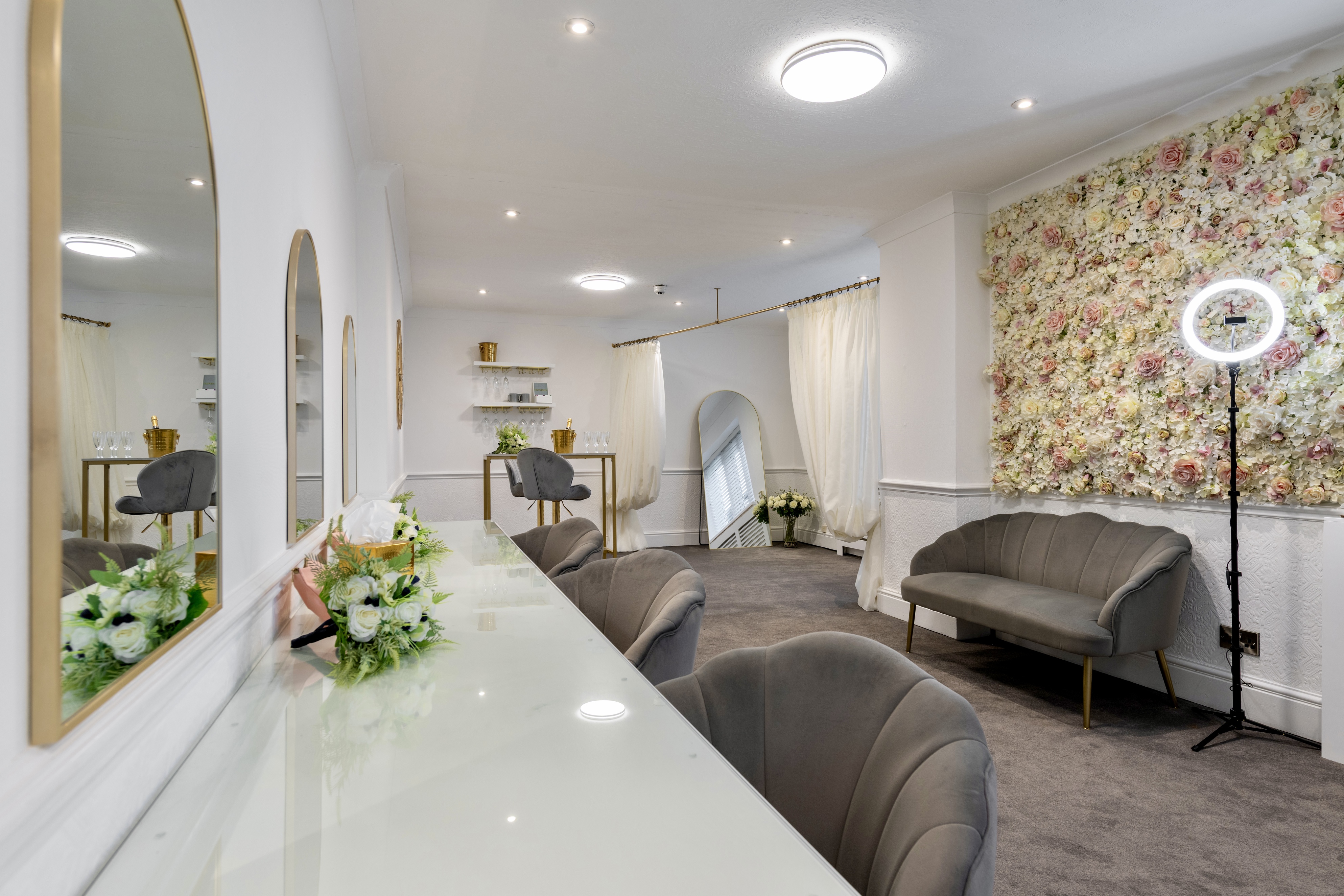 The Harwood Suite has been transformed into the destination for Pre Wedding Prep, where the magic happens. Relaxed seating, flower selfie wall, changing area, pop up bar, wall hangers, large mirrors and vanity area. Invite your maid of honor and bridal party to get ready together with your line-up of trusted chosen suppliers. Give them time and space for hair, nails, makeup and final dress alterations.