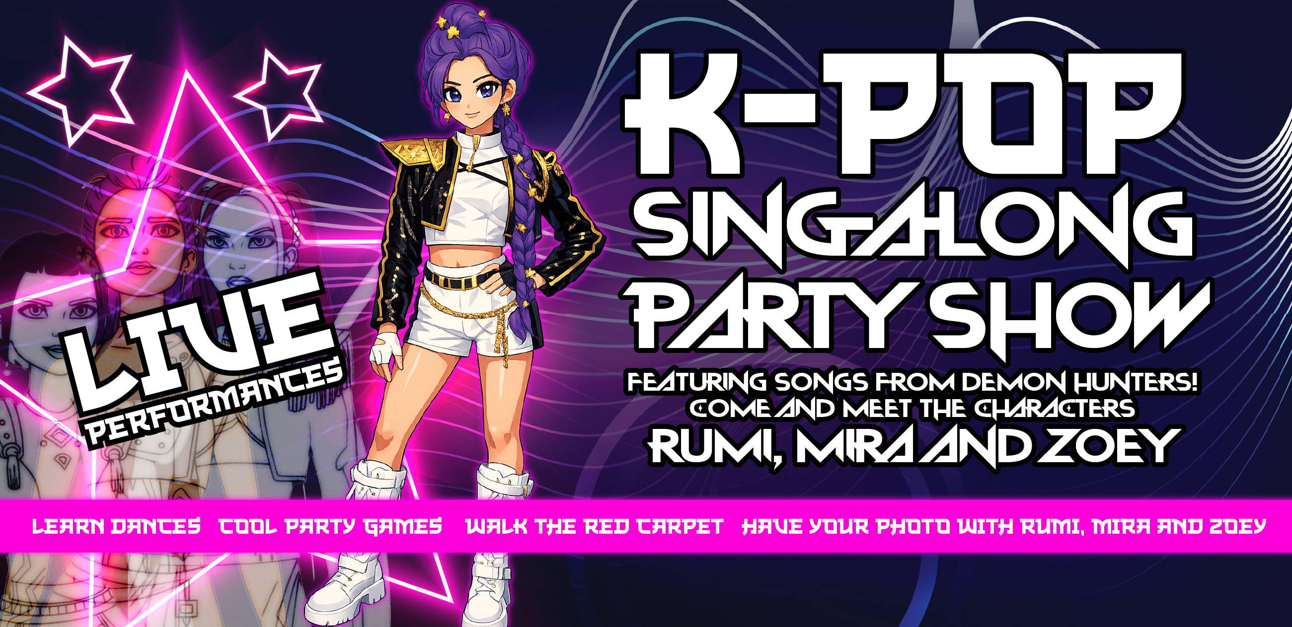 Come join Rumi, Mira and Zoey for a day full of popstar fun! Watch live singing performances, learn iconic dances, learn popstar poses and dance with your favourite characters!